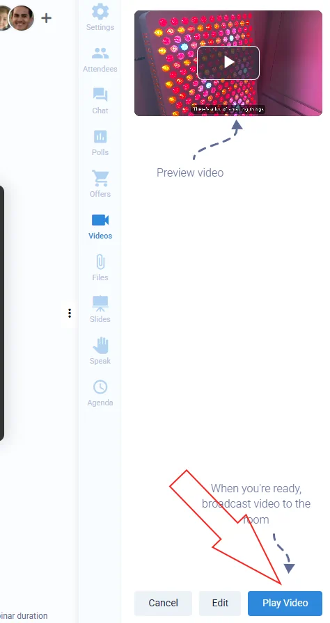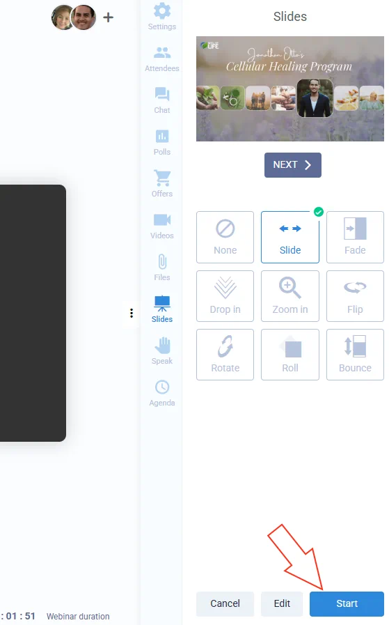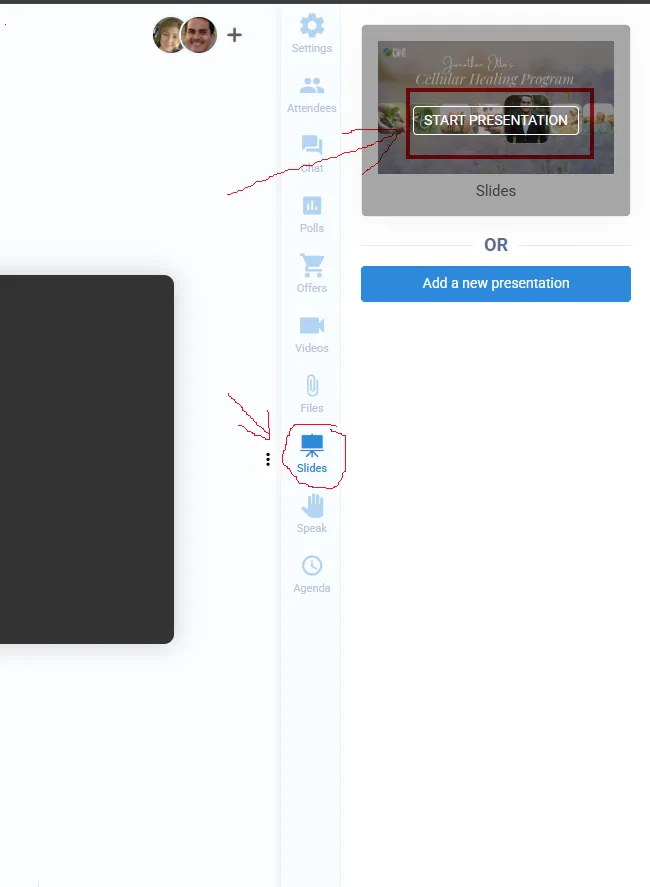To start the presentation, click on the Slides icon on the right side of the screen. If you have several presentations, select the one you want to run and click start presentation.