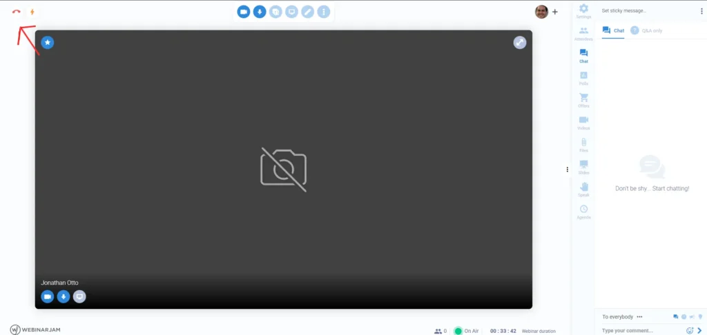 If you need to leave the Live Room, first make sure that you are not the only host. If you are not the only host, close the browser window in which the Live Room is open. (Don’t Press the Red Phone Icon)